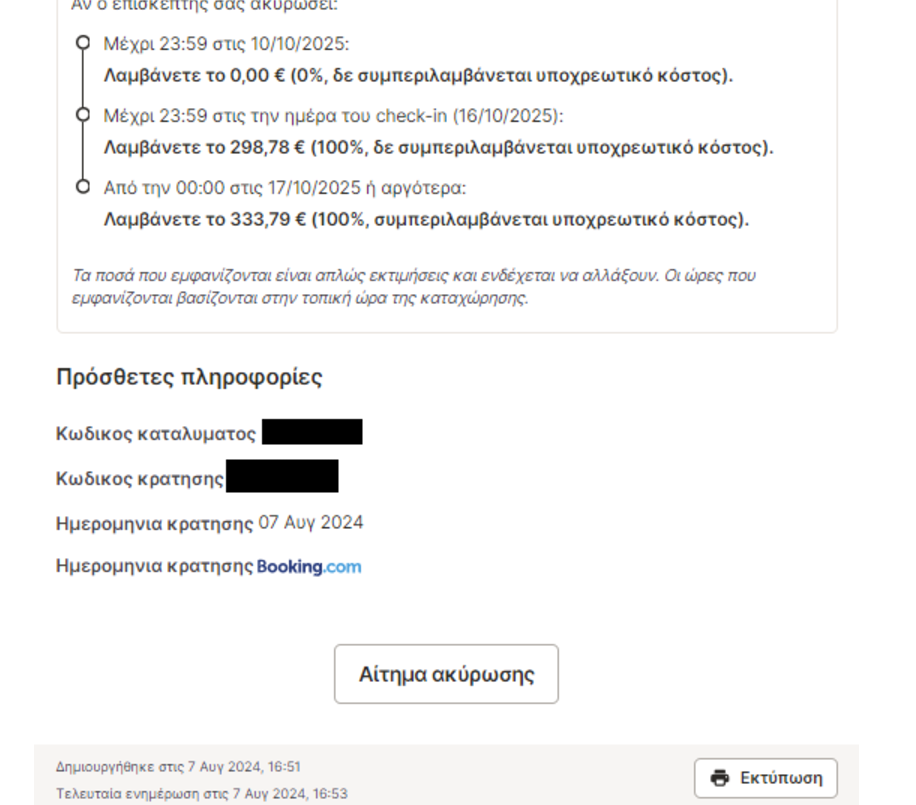 Ακυρώσεις που δεν οφείλονται σε λόγους ανωτέρας βίας: Εάν η ακύρωση δεν οφείλεται σε περιστατικό ανωτέρας βίας ή εάν δεν μπορείτε να προσκομίσετε έγγραφα, η ακύρωση θα επιβαρυνθεί με ακυρωτικά, τα οποία πρέπει να γίνουν αποδεκτά κατά την υποβολή της αίτησης ακύρωσης. Για περισσότερες λεπτομέρειες σχετικά με το τι θεωρείται ανωτέρα βία, κάντε κλικ [εδώ].