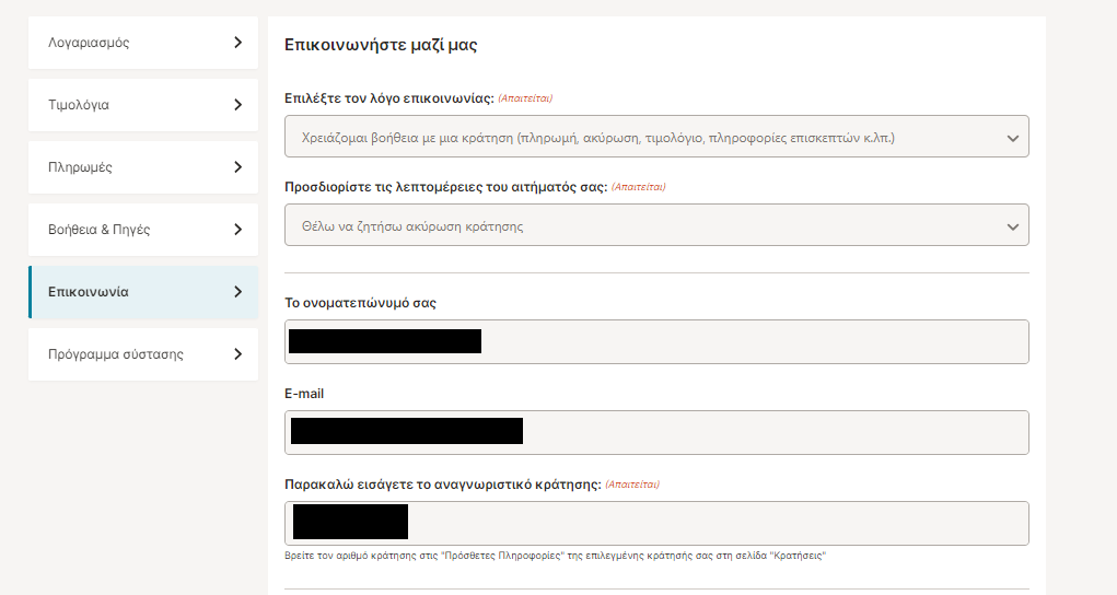 - «Χρειάζομαι βοήθεια με μια κράτηση (πληρωμή, ακύρωση, τιμολόγιο, πληροφορίες για τον επισκέπτη, κ.λπ.)»