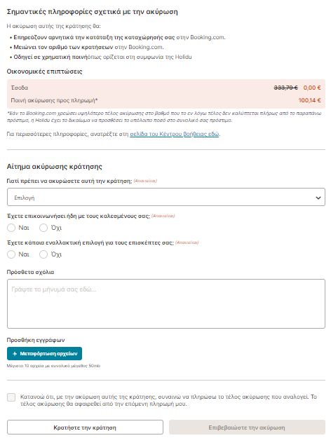 Μετά τη συμπλήρωση της φόρμας, θα ενημερωθείτε για τυχόν προβλεπόμενες χρεώσεις που σχετίζονται με την ακύρωση. Μόλις συμφωνήσετε, μπορείτε να υποβάλετε την αίτηση ακύρωσης. Παρακαλείστε να σημειώσετε ότι τα τέλη ενδέχεται να είναι υψηλότερα ανάλογα με την τιμή της μετεγκατάστασης των επισκεπτών.