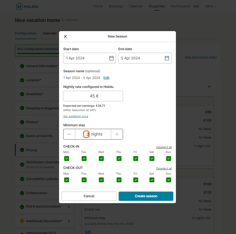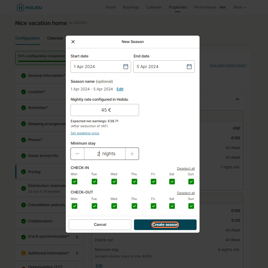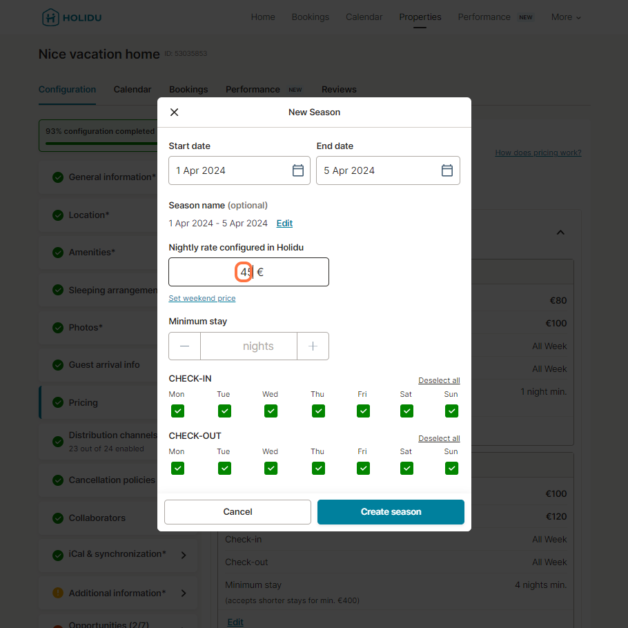 - Choose whether you want to set a separate nightly rate for the weekends during this season.