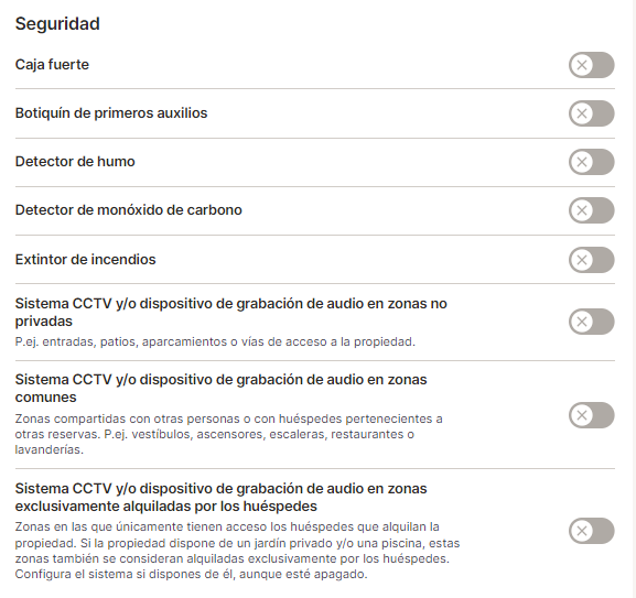 Si tu propiedad tiene cámaras de seguridad (CCTV) u otros dispositivos de grabación, es obligatorio por ley mencionarlos en la descripción de tu propiedad y configurarlos en la sección de las instalaciones.