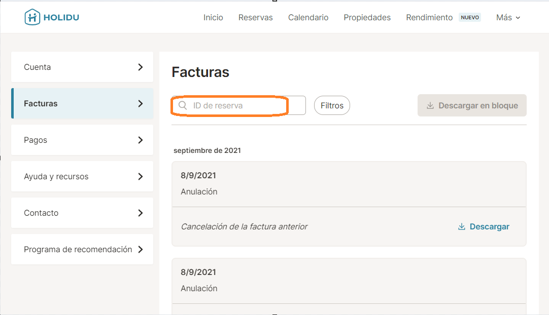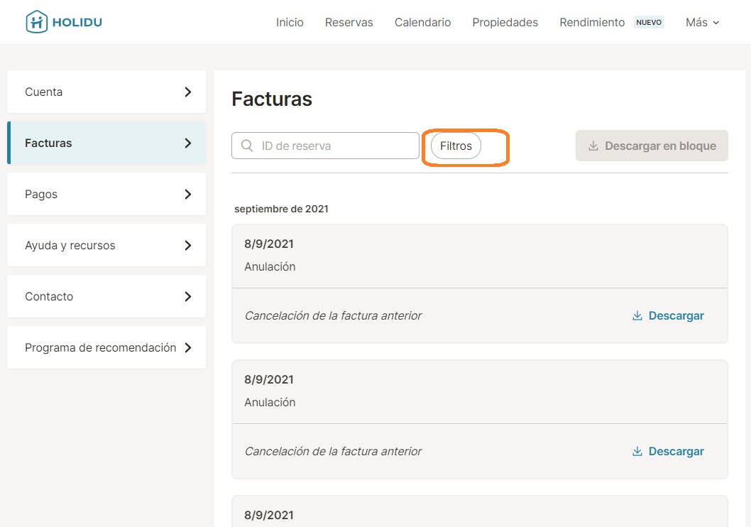 - Antes de seleccionar la “descarga en bloque”, debes elegir el rango de fechas para el que quieras descargar las facturas.