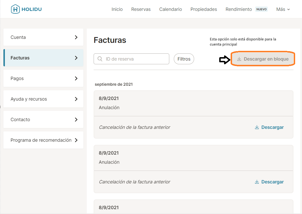 - Solo la cuenta principal tienen acceso a la sección de facturas y pagos. Los colaboradores no tienen acceso a estas.