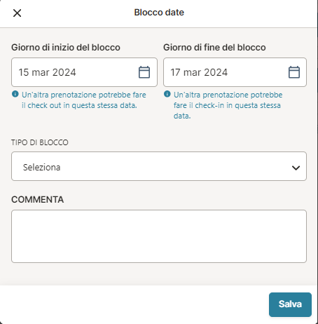 - Blocca date: questa opzione è per tutte le date che devono essere bloccate per altri motivi. È possibile utilizzare questa opzione per riparazioni, manutenzione, uso personale, ecc.