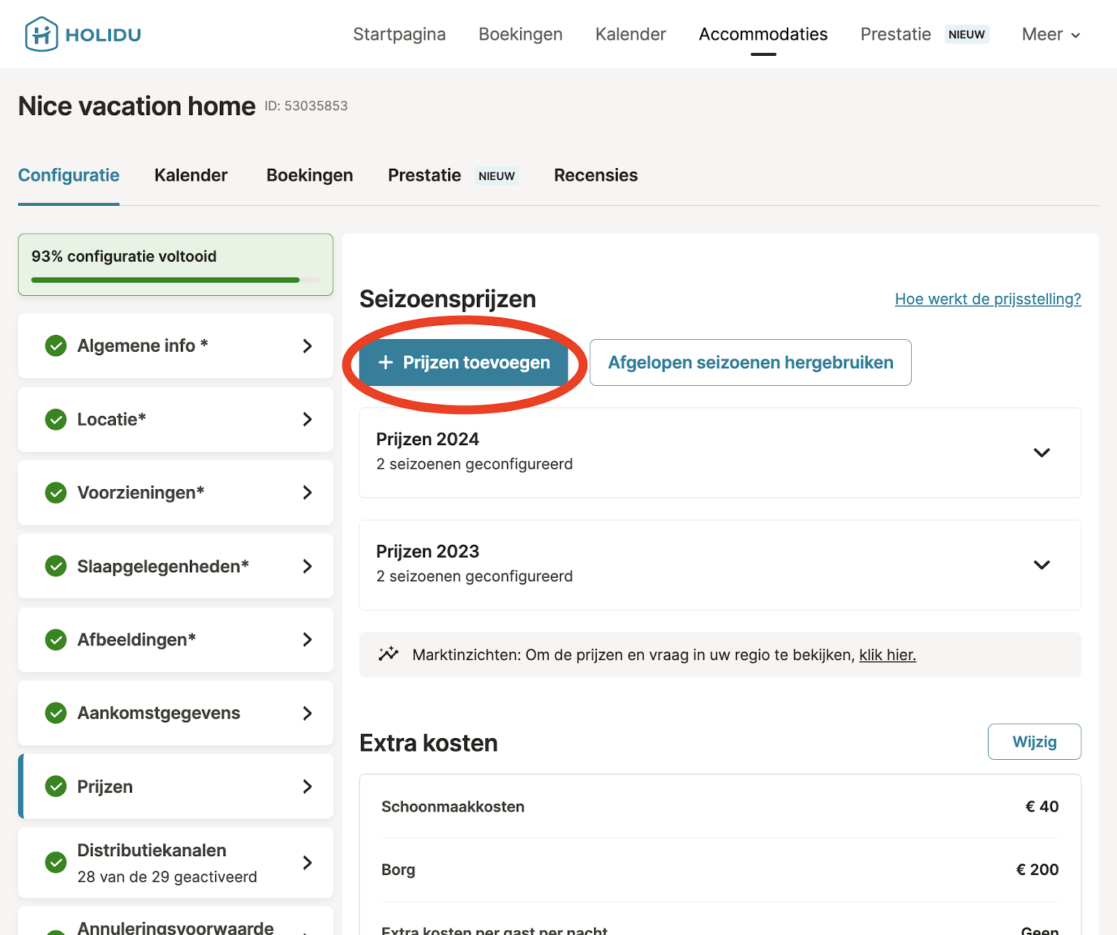 2) Klik op Prijzen toevoegen. U kunt verschillende prijzen of seizoenen aanmaken.
