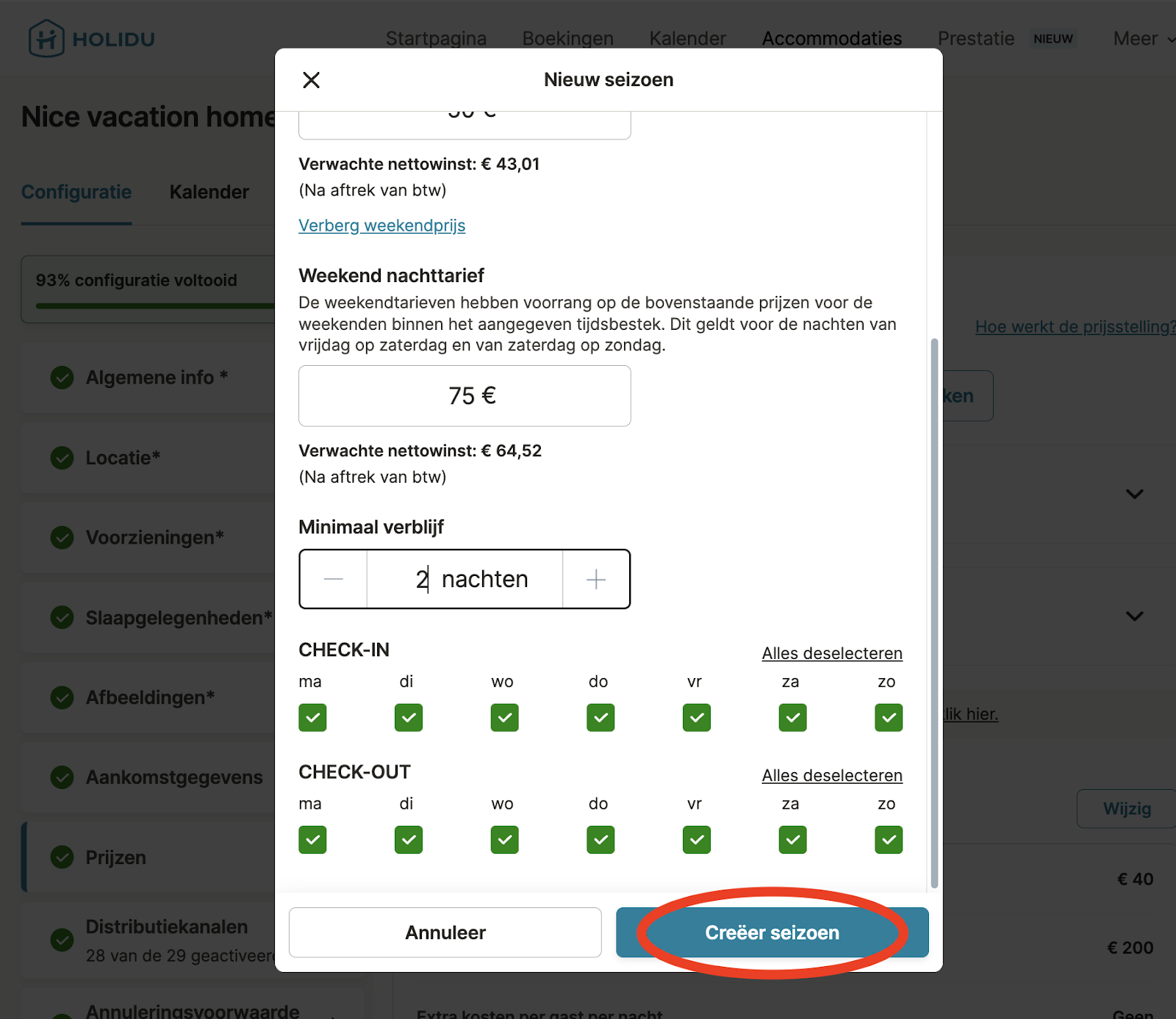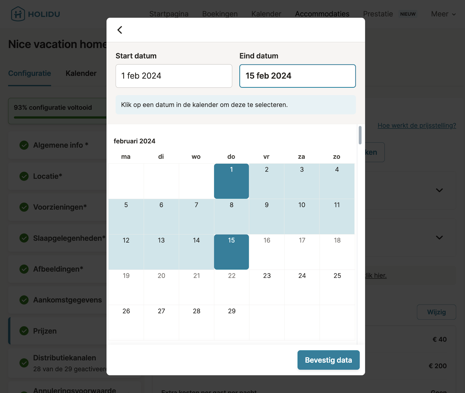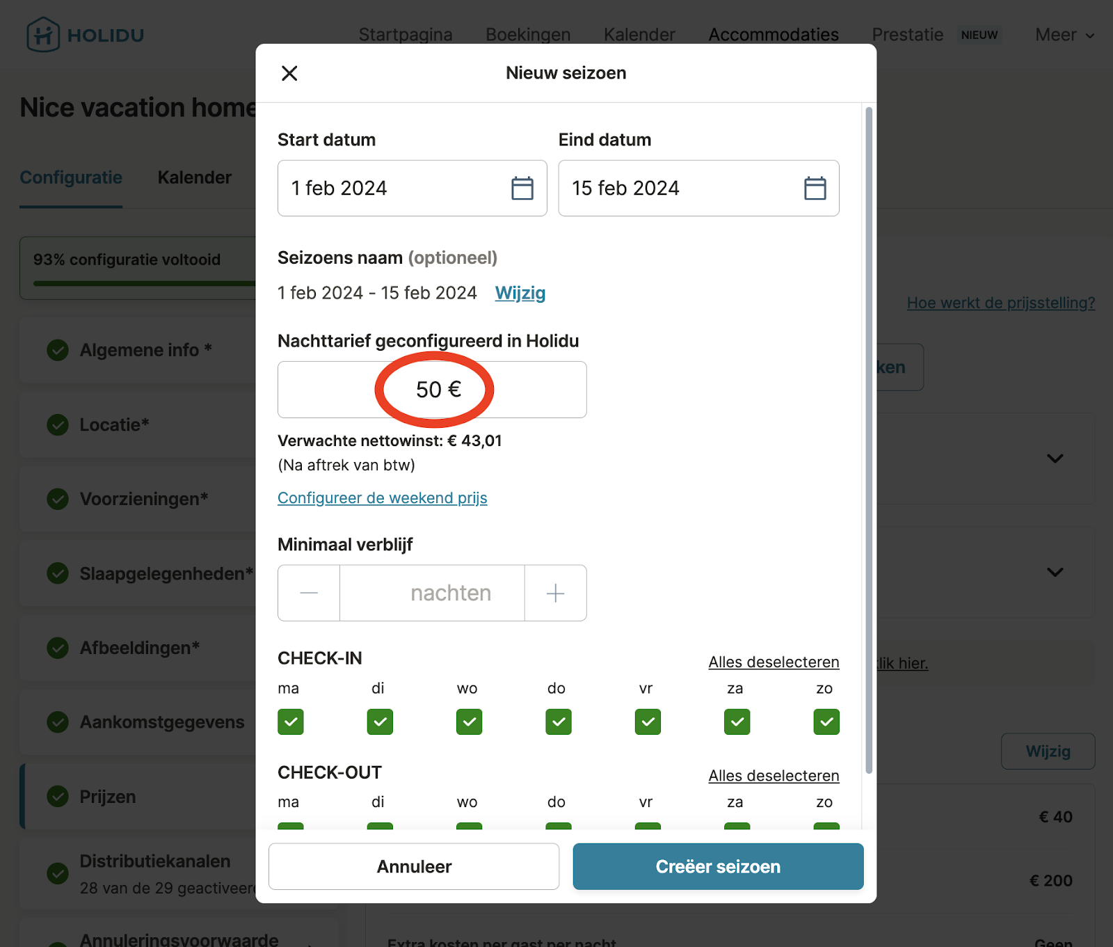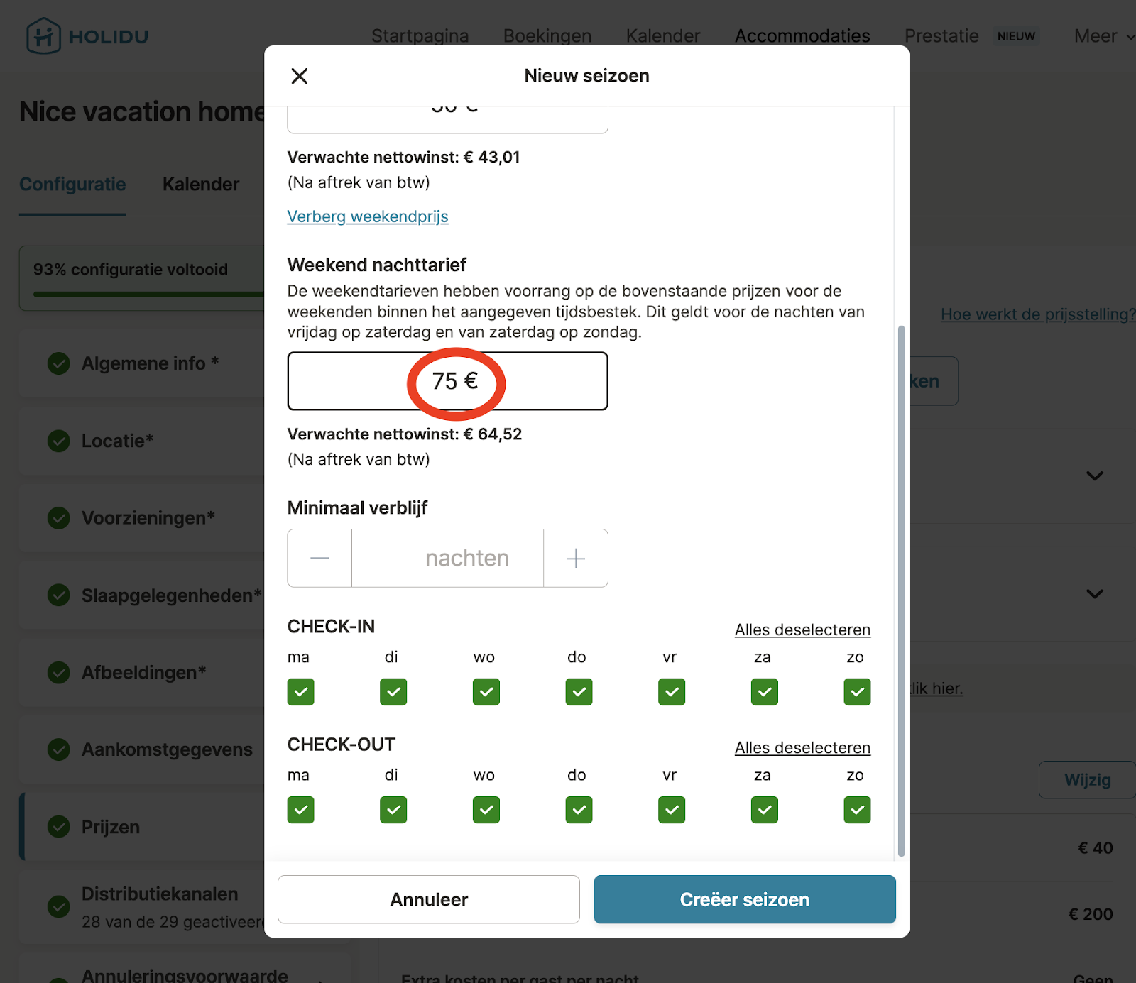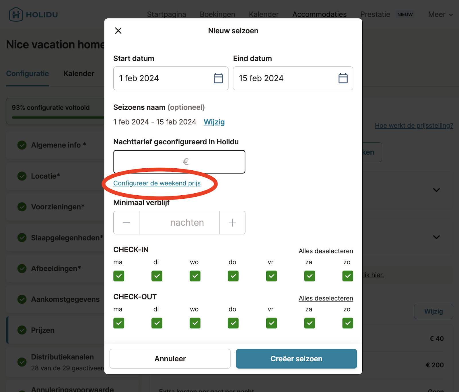 5) Er verschijnt een venster zodra u de data heeft bevestigd. U kunt uw wekelijkse nachtprijs toevoegen en daaronder ziet u de optie “Configureer de weekendprijs”.