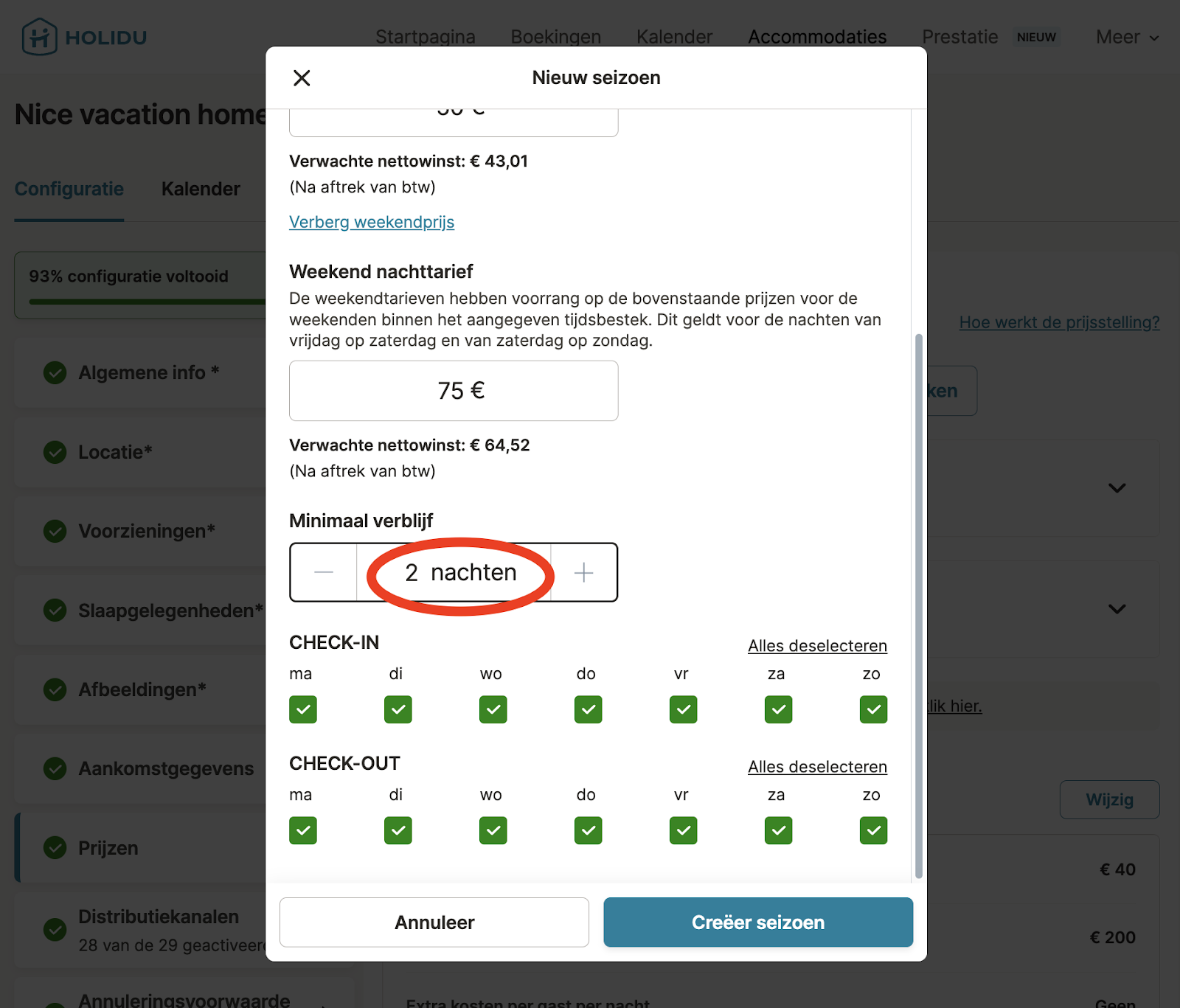 8) Voeg de minimale verblijfsduur toe voor elk seizoen dat u maakt.